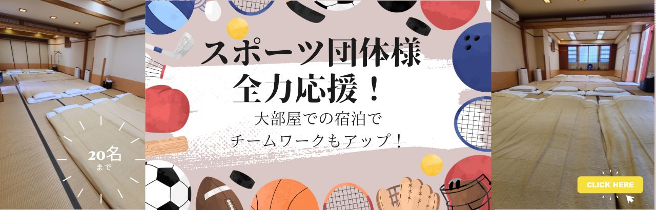 - 2025/08/03 『スポーツの宿情報』ページ更新、大部屋でのスポーツ団体様の宿泊予約を再開しております。